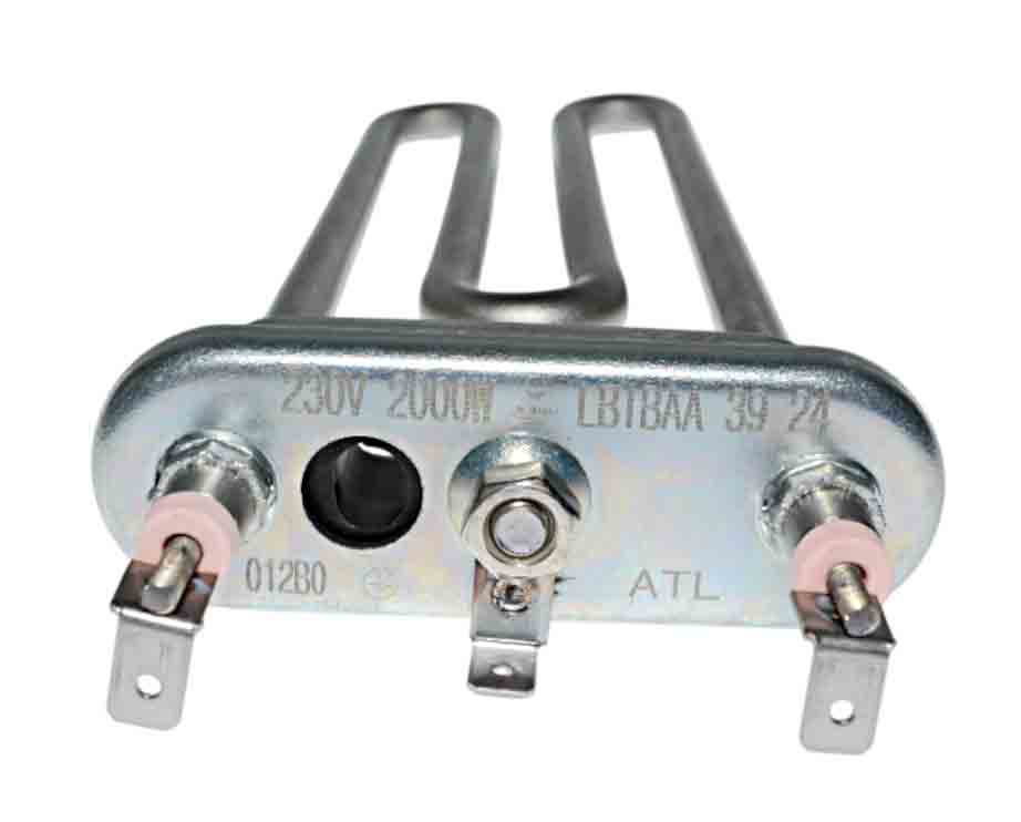 Тэн 2000W, прямой, с отверстием под датчик, L=205 мм, l=15 мм, резинка с "юбкой", ATL, для Bosch Maxx, подходит к Hansa.