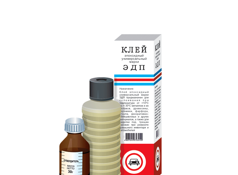 Эпоксидный клей ЭДП (ТУ 2385-024-75678843-2010) предназначен для склеивания при температуре от +10 0С до +30 0С металлов и их сплавов, древесины, керамики, фарфора, стекла, декоративно-облицовочных и других материалов, а также для заделки пор, трещин, раковин при ремонте домашнего инвентаря и автомобиля.