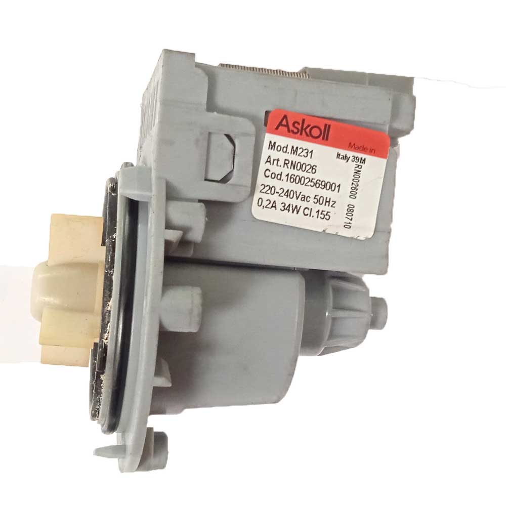 Насос сливной (помпа) M231 RN0026 16002569001 Askoll: 34W, крепл. — 3 винта, выводы — сзади вместе (демонтаж)