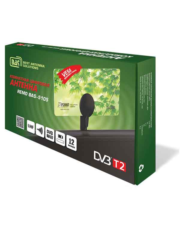 Антенна «BAS-5105-5V» предназначена для приема телевизионных программ в полосе частот 174...862 МГц (каналы с 6 по 69 МВ и ДМВ). Антенна принимает сигналы аналогового и цифрового телевидения формата DVB-T/DVB-T2. Антенна может установлена на телевизоры с креплением FDMI VESA, либо на корпус цифрового приемника (ресивера) или любую гладкую поверхность.